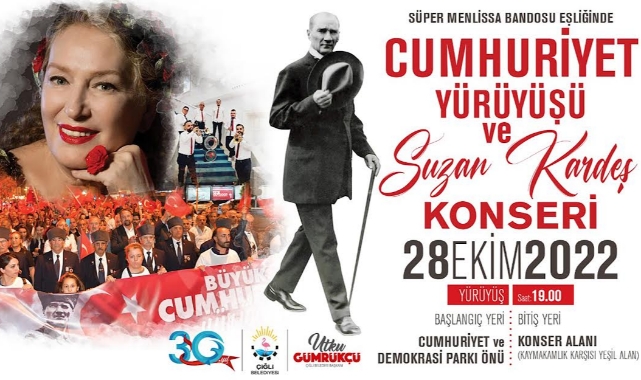 Çiğli Belediyesi’nin 29 Ekim Cumhuriyet Bayramı kapsamında hazırlıklarını tamamladığı etkinlikler, 25 Kasım Salı günü Akvaryum Kafe Restoran’da ilçe protokolünün katılımıyla gerçekleştirilecek “Cumhuriyet Resepsiyonu” ile başlayacak. Aynı gün Atatürk Spor Salonu’nda Masa Tenisi Turnuvası düzenlenecek. 26 Ekim Çarşamba günü Kasaplar Meydanı’nda Cumhuriyet Kermesi kurulacak. Kermeste Çiğli’nin emektar kadınlarının el emeğiyle ürettikleri ürünlerin satışı yapılacak. Saat 13:00’de ise Kasaplar Meydanı’nda Tavla ve Dama Turnuvası düzenlenecek. 27 Ekim Perşembe günü Çiğli Belediyesi Fakir Baykurt Salonu’nda “Seni Anlatabilmek” isimli tiyatro oyunu sahnelenecek. Kutlamalar 28 Ekim Cuma günü Süper Menlissa Bandosu eşliğinde gerçekleştirilecek Cumhuriyet Yürüyüşü ile devam edecek. Cumhuriyet ve Demokrasi Parkı önünden başlayacak yürüyüşün bitiş noktasında sanatçı Suzan Kardeş, Türk müziğinin sevilen şarkılarını Çiğlililer ile birlikte seslendirecek.