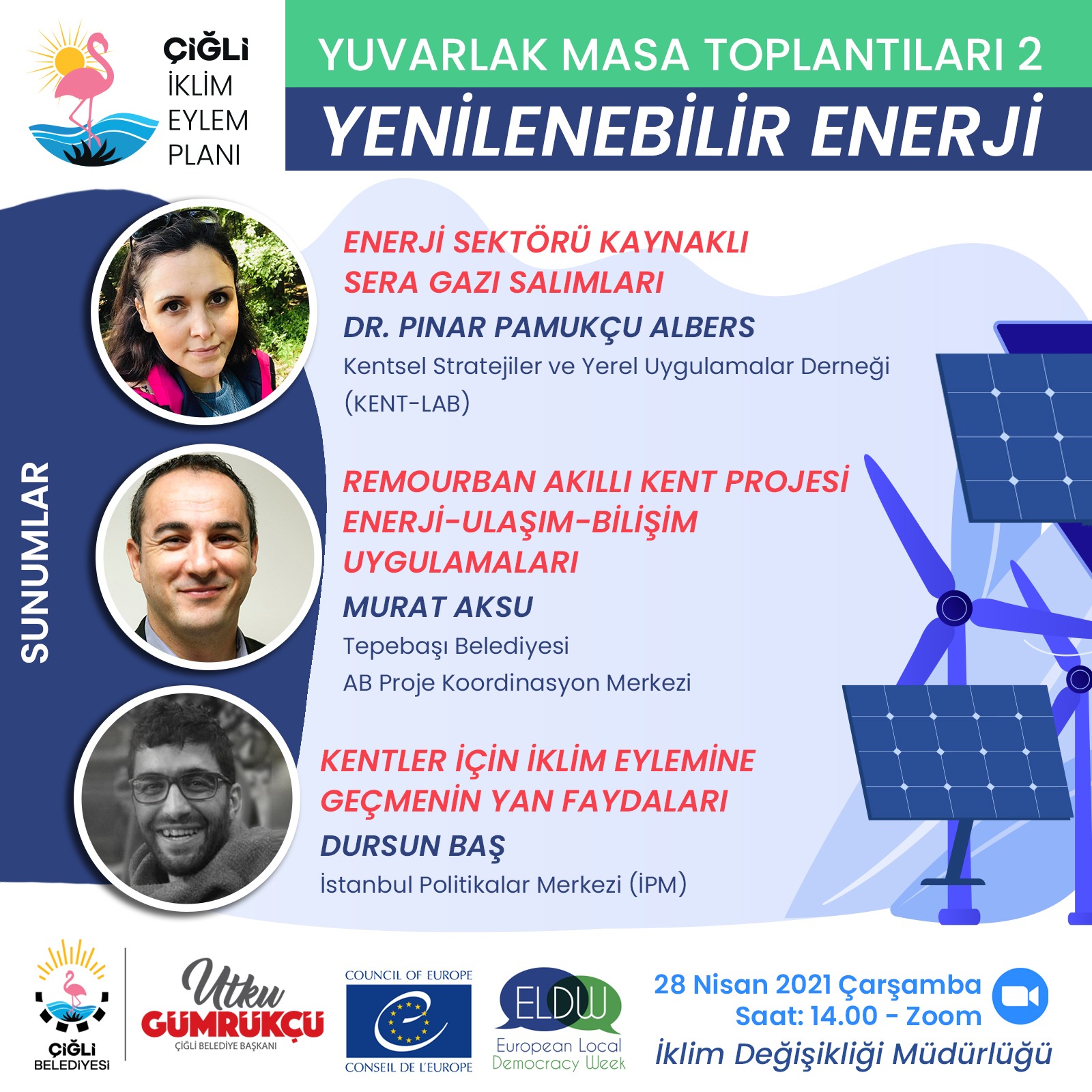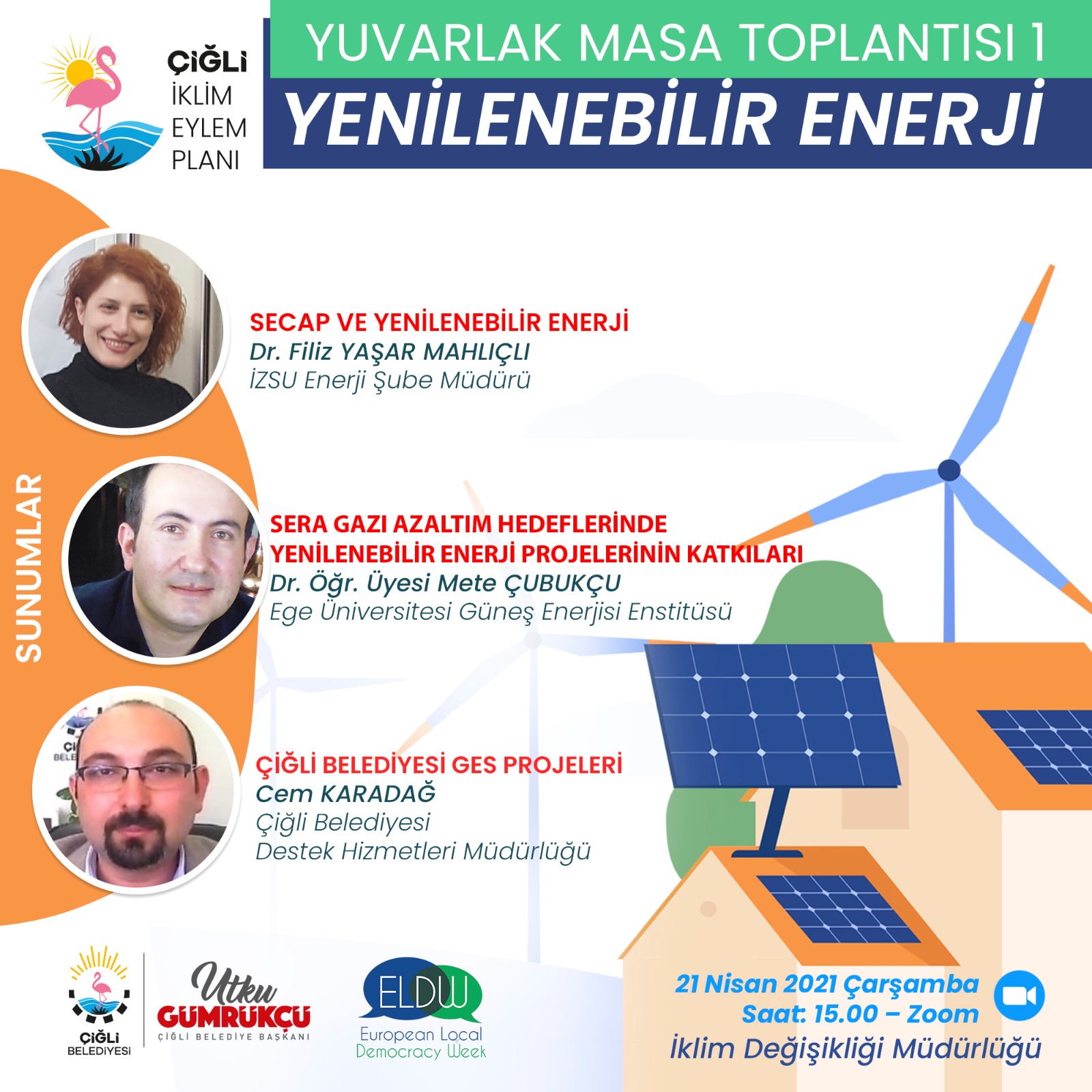 Başkan Utku Gümrükçü’nün açılış konuşmasını yaptığı ilk yuvarlak masa toplantısı, “Yenilenebilir Enerji" başlığıyla çevrimiçi olarak gerçekleştirildi. Toplantıda CHP Enerji ve Altyapı Projelerinden Sorumlu Genel Başkan Yardımcısı Ahmet Akın parti projeleriyle ilgili bilgilendirmede bulundu. Dr. Filiz Yaşar Mahlıçlı “SECAP ve Yenilenebilir Enerji”, Dr. Öğr. Üyesi Mete Çubukçu “Sera Gazı Azaltım Hedeflerinde Yenilenebilir Enerji Projelerinin Katkıları”, Mühendis Cem Karadağ ise “Çiğli GES Projeleri” konularında sunum yaptı.