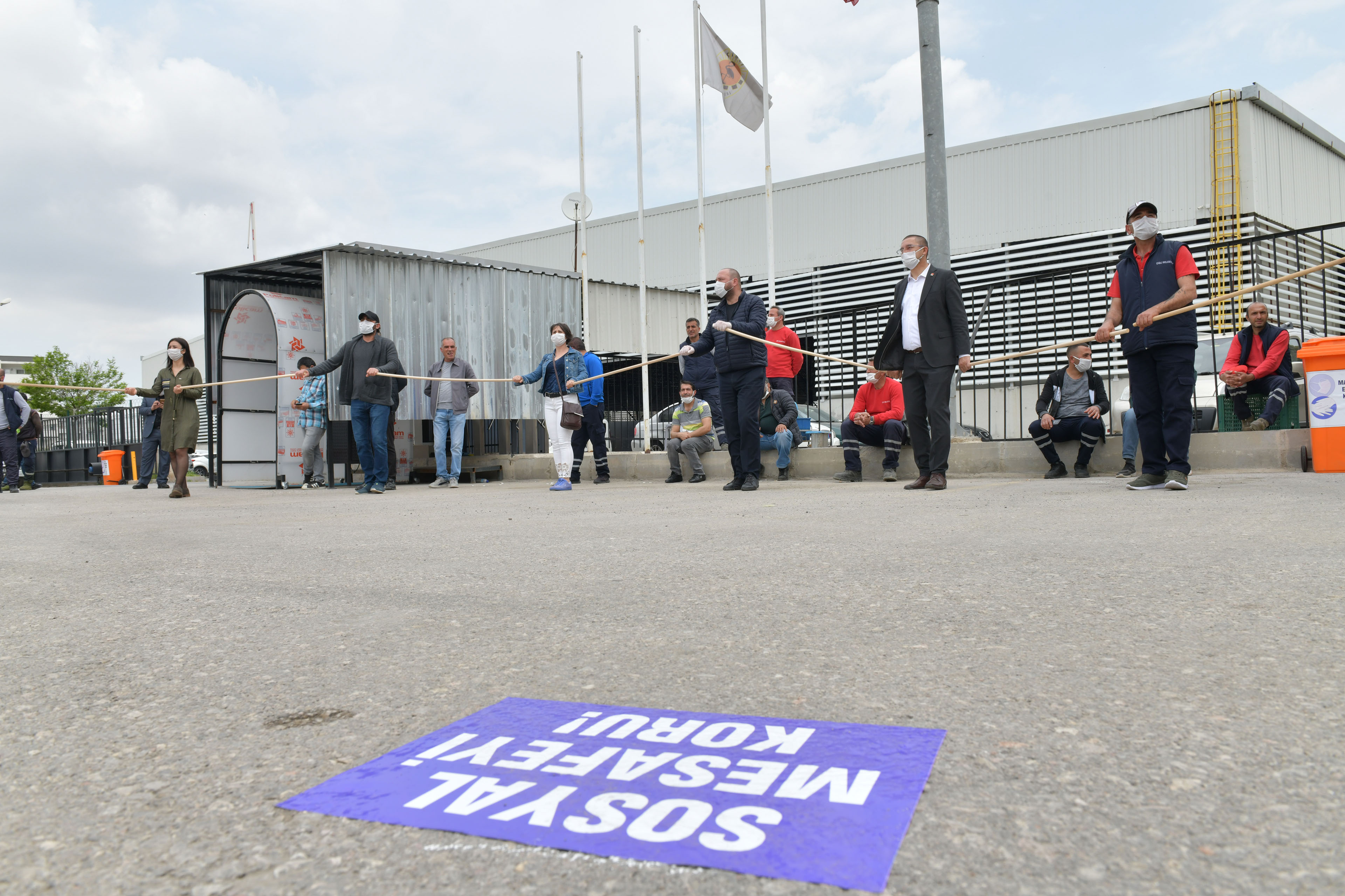 Geçmişten bugüne 1 Mayıs İşçi Bayramı kutlamalarının klasiği haline gelen halay seremonisi, Başkan Gümrükçü ve işçiler tarafından farklı bir yöntemle icra edildi. Koronavirüs ile mücadele kapsamında olası teması engellemek için Başkan Gümrükçü ve işçiler ellerindeki fırça saplarının birer uçlarını tutarak halay çektiler.
