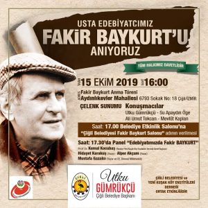 Düzenlen etkinlikler kapsamında, değerli yazarın isminin yaşatılması amacıyla belediye konferans salonunun adı, alınacak meclis kararıyla “Çiğli Belediyesi Fakir Baykurt Salonu” olarak değiştirilecek. Anma etkinlikleri kapsamında son olarak Çiğli Belediyesi ile Yeni Kuşak Köy Enstitüleri Derneği’nin birlikte organize edeceği “Edebiyatımızda Fakir Baykurt” paneli gerçekleştirilecek. Paneli, Yeni Kuşak Köy Enstitüleri Derneği Genel Başkanı Prof. Dr. Kemal Kocabaş yönetecek. Panelde değerli yazarlar Hidayet Karakuş ve Alper Akçam ile 16. ve 22. dönem CHP Milletvekili Mustafa Gazalcı konuşma yapacak.