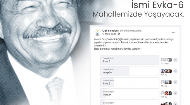 Başkan Gümrükçü’nün çağrısına en çok yorumun yapıldığı Ataşehir, Atatürk, Evka-5, Evka-6 ve Yakakent Mahalleleri arasında anket yapıldı. Çiğli Belediyesi’nin resmi sosyal medya hesapları üzerinden yapılan ankete katılanların büyük çoğunluğu, Kamer Genç’in isminin verileceği parkın Evka-6 Mahallesi’nde yapılması doğrultusunda oy kullandı. Göreve gelirken Çiğli’yi,Çiğlililer ile birlikte yöneteceğinin sözünü veren Başkan Gümrükçü, bu hareketiyle yapılacak parkın yerini vatandaşlara soran ilk Belediye Başkanı oldu.