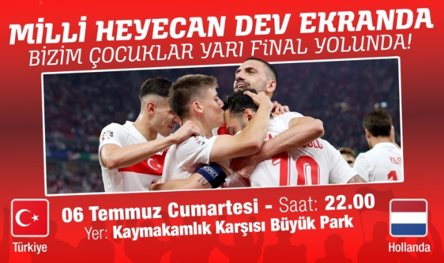 EURO 2024 F Grubu'ndan çıkan ve son 16 turunda turnuvanın flaş takımı Avusturya'yı eleyerek Çeyrek Finale yükselen A Milli Futbol Takımımız, 6 Temmuz cumartesi günü Hollanda ile karşı karşıya gelecek. Çiğli Belediyesi, Kaymakamlık karşısındaki Büyük Park'ta kuracağı dev ekran ile milli maç coşkusunu sporseverler ile buluşturacak. Saat 22.00'de başlayacak maçı Çiğlililer dev ekranda tek yürek olarak izleyecek.