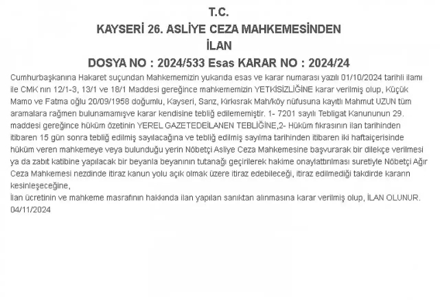Kayseri 26. Asliye Ceza Mahkemesi, Cumhurbaşkanı Erdoğan’a hakaret ettiği belirtilen 66 yaşındaki Kayseri'nin, Sarız ilçe nüfusuna kayıtlı Mahmut Uzun’un tüm aramalara rağmen bulunamadığını belirterek resmi ilan verdi. İlanda şu ifadelere yer verildi:“Cumhurbaşkanına hakaret suçundan mahkememizin yukarda esas ve karar numarası yazılı 01/10/2024 tarihli ilamı ile CMK’nın 12/1 -3, 13/1, ve 18/1 maddesi gereğince mahkememizin yetkisizliğine kara verilmiş olup, Küçük Mamo ve Fatma oğlu 20/09/1958 doğumlu Kayseri, Sarız, Kırkısrak Mahalle/Köy nüfusuna kayıtlı Mahmut uzun tüm aramalara rağmen bulunamamış ve karar kendisine tebliğ edilememiştir. 7201 sayılı Tebligat Kanununun 29. maddesi gereğince hüküm özetinin yerel gazetede ilanen tebliğine, hüküm fıkrasının ilan tarihinden itibaren 15 gün sonra tebliğ edilmiş sayılacağına ve tebliğ edilmiş sayılma tarihinden itibaren iki hafta içerisinde hüküm veren mahkemeye veya bulunduğu yerin Nöbetçi Asliye Ceza Mahkemesine başvurarak bir dilekçe verilmesi ya da zabıt katibine yapılacak bir beyanla beyanının tutanağı geçirilerek hakime onaylattırılması suretiyle Nöbetçi Ağır Ceza Mahkemesi nezdinde itiraz kanun yolu açık olmak üzere itiraz edebileceği, itiraz edilmediği takdirde kararın kesinleşeceğine, ilan ücretinin ve mahkeme masrafının hakkında ilan yapılan sanıktan alınmasına karar verilmiş olup, ilan olunur”