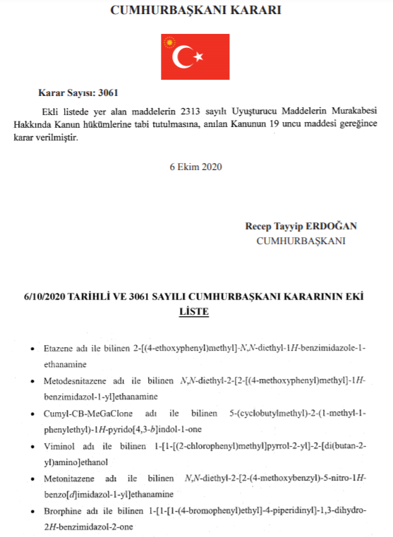 Resmi Gazete’de yer alan kararda “Ekli listede yer alan maddelerin 2313 sayılı Uyuşturucu Maddelerin Murakabesi Hakkında Kanın hükümlerine tabi tutulmasına, anılan Kanunun 19 uncu maddesi gereğince kabul verilmiştir.” İfadeleri kullanıldı.