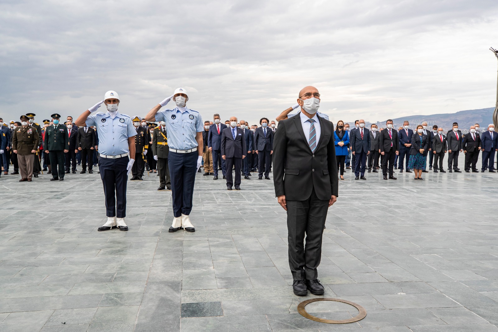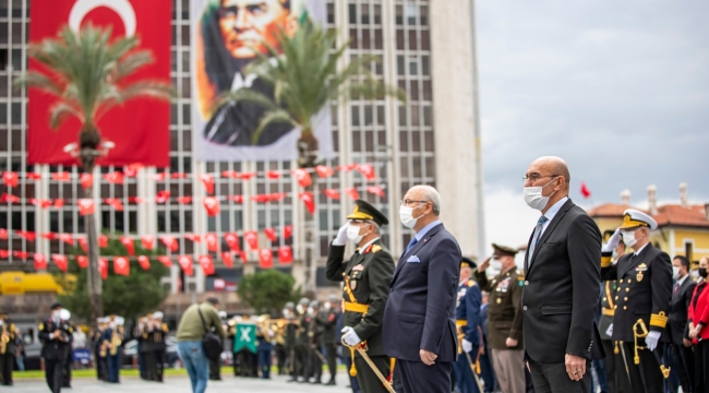 Törende Cumhuriyet Meydanı'ndaki Atatürk Anıtı'na İzmir Valiliği, Ege Ordusu ve Garnizon Komutanlığı ile İzmir Büyükşehir Belediyesi'nin çelenkleri konuldu. Tören, saygı duruşu ve İstiklal Marşı'nın ardından son buldu.