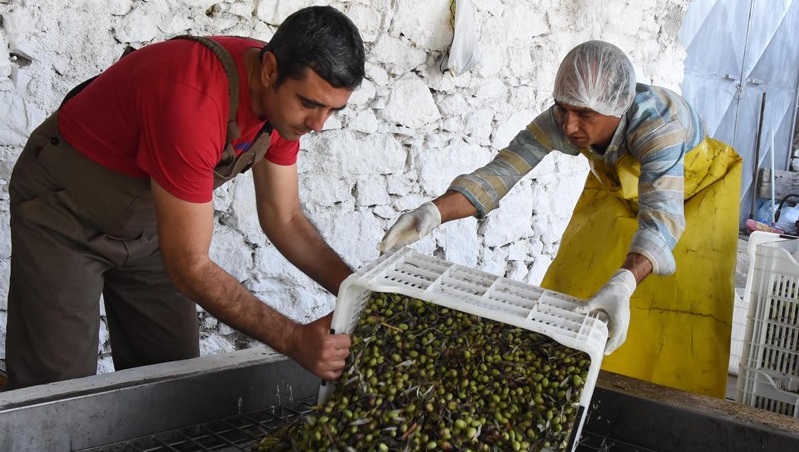 Tarladan toplanan zeytinler fabrikaya getirildikten sonra önce tartılıyor, yapraklarından ayrıştırıldıktan sonra yıkama makinesinde yıkanıyor. Zeytinler yıkandıktan sonra, taş baskıya giriyor. Yaklaşık 40 dakika boyunca dönen taş, zeytini ezerek hamur haline getiriyor. Hamura dönüşen zeytin, kıl çuvallara dolduruluyor ve 100 tane çuval, yine insan gücü ile baskı makinesine yerleştiriliyor. Yerleştirme işlemi bittikten sonra baskı makinesi çalıştırılıyor, ezilen zeytinin sıkım işlemi başlıyor. Sıkım işleminin ardından kara su yağ ile birlikte tanklara giriyor. Dinlenme tanklarında karasu, yağ ve zeytinin tortusu birbirinden ayrıştırılıyor. Dibindeki tortular, vanalardan çıkarılıyor. Yağ dinlenmeye bırakılıyor. Bir gün boyunca dinlenen yağın daha sonra asitleri ölçülüyor. Böylece zeytinyağı tüketim için hazır hale geliyor.