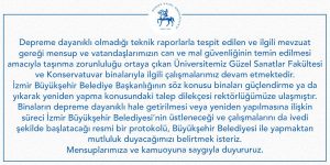 DEÜ üniversitesi yaptığı Soyer’in yaptığı açıklamaya cevap verdi. Yapılan açıklamada, “İzmir Büyükşehir Belediyesi’nin söz konusu binaları güçlendirme ya da yıkarak yeniden yapma konusundaki talep dilekçesi rektörlüğümüze ulaşmıştır. Binaların depreme dayanıklı hale getirilmesi veya yeniden yapılmasına ilişkin süreci İzmir Büyükşehir Belediyesi’nin üstleneceği ve çalışmalarını da ivedi şekilde başlatacağı resmi protokolü, Büyükşehir Belediyesi ile yapmaktan mutluluk duyacağımızı belirtmek isteriz” dedi.