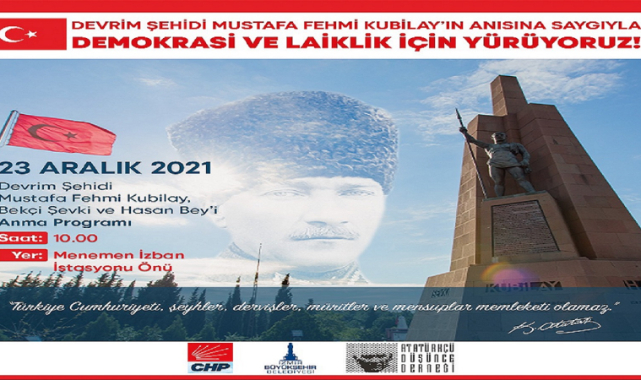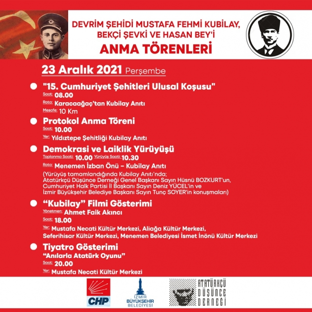 Menemen’de 91 yıl önce Cumhuriyet karşıtları tarafından katledilen Şehit Asteğmen Mustafa Fehmi Kubilay, Bekçi Şevki ve Hasan Bey için 23 Aralık Perşembe günü düzenlenecek anma etkinlikleri Menemen Karaağaç yolunda 08.00’de 10 kilometrelik “15. Cumhuriyet Şehitleri Ulusal Koşusu” ile başlayacak. Koşu Yıldıztepe Şehitliği Kubilay Anıtı önünde son bulacak. Kubilay Anıtı önünde saat 10.00’daki protokol anma töreninin ardından Atatürkçü Düşünce Derneği (ADD) Menemen Şubesi tarafından Demokrasi ve Laiklik Yürüyüşü yapılacak. 10.30’da Menemen İZBAN istasyonu önünden başlayacak yürüyüş Kubilay Anıtı’nda son bulacak. Yürüyüşten sonra İzmir Büyükşehir Belediye Başkanı Tunç Soyer katılımcılara hitaben bir konuşma yapacak.