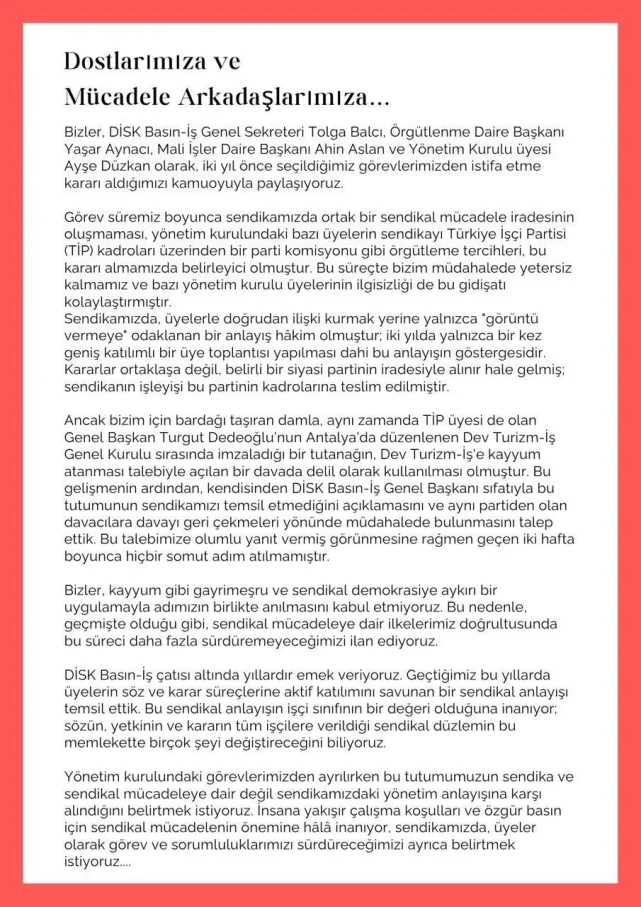 DİSK’e bağlı Basın-İş Sendikası’nda büyük bir yönetim krizi patlak verdi.Genel Sekreter Tolga Balcı, Örgütlenme Daire Başkanı Yaşar Aynacı, Mali İşler Daire Başkanı Ahin Aslan ve Yönetim Kurulu Üyesi Ayşe Düzkan, yaptıkları ortak açıklama ile görevlerinden istifa ettiler. İstifa eden yöneticiler, sendika yönetiminin Türkiye İşçi Partisi (TİP) kadroları tarafından yönlendirilmesine tepki göstererek, sendikanın “parti komisyonuna” dönüştüğünü dile getirdi.Yapılan açıklamada, sendikanın karar alma süreçlerinin ortaklaşmadan uzaklaştığı ve belirli bir siyasi partinin iradesine teslim edildiği ifade edilirken, Genel Başkan Turgut Dedeoğlu’nun TİP üyeliği ve Antalya’daki Dev Turizm-İş Genel Kurulu’nda imzaladığı tutanak bardağı taşıran son damla olarak vurgulandı.İstifa eden yöneticiler, sendikada üye temelli katılım anlayışının zayıfladığını, kararların sadece görüntüye odaklandığını ve üyelerin iradesinin yok sayıldığını ifade etti.ALINAN KARARLAR TİP İNİSİYATİFİYLE ALINIYORMUŞ!Ayrıca, sendikanın işleyeşindeki kadroların TİP’e yakın oldukları, alınan kararların bu çevrelerin inisiyatifiyle alındığı ve bu durumun sendikal mücadeleye zarar verdiği vurgulandı.İstifaların temel nedeni olarak gösterilen olay ise, DİSK Basın-İş Genel Başkanı Turgut Dedeoğlu’nun imzasının Dev Turizm-İş Sendikası’na kayyum atanması istemiyle açılan bir davada delil olarak kullanılması oldu.Açıklamada, Dedeoğlu’nun bu olaya ilişkin kamuoyuna ve sendika üyelerine açıklama yapmasının talep edildiği, fakat iki hafta boyunca somut bir adım atılmadığı vurgulandı.İstifa eden yöneticiler, “Kayyum gibi antidemokratik bir uygulamayla adımızın anılmasını kabul etmiyoruz” ifadeleriyle, sendikal mücadeleye olan inançlarının sürdüğünü fakat mevcut yönetim anlayışıyla çalışmaya devam edemeyeceklerini açıkladılar."GÖREVDEN AYRILIŞIMIZ SENDİKAL MÜCADELEYE DEĞİL, MEVCUT YÖNETİM ANLAYIŞINA KARIŞIDIR"DİSK Basın-İş’te uzun yıllardır emek verdiklerini hatırlatan istifa eden yöneticiler, açıklamalarını şöyle sonlandırdı:“Bizler, üyelerin söz ve karar süreçlerine aktif katılımını savunan bir sendikal anlayışı temsil ettik. Bu ilkelerin işçi sınıfı için bir değer olduğunu biliyoruz. Bu görevden ayrılışımız sendikal mücadeleye değil, mevcut yönetim anlayışına karşıdır. İnsan onuruna yaraşır çalışma koşulları ve özgür basın için mücadelemize üye olarak devam edeceğiz.”Yapılan açıklamanın tam hali ise şu şekilde: