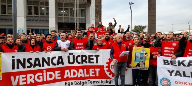 İşçiler adına konuşma yapan DİSK Ege Bölge Temsilcisi Memiş Sarı, “Asgari ücretin Türkiye’ de ortalama ücret haline geldiği gerçeği yok sayılırken, Dünyada asgari ücretin bu kadar yaygın olduğu bir ülke daha gösterilemiyor. Ülkeyi yöneten siyasi iktidar, göz göre göre Türkiye İşçi Sınıfını asgari ücrete mahkûm ediyor.”