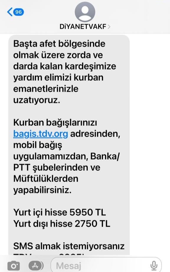 GÜLPERİ TİBİN/ EGE'YE BAKIŞ - Kurban Bayramı’na 27 gün kalmışken Diyanet Vakfı tarafından yurttaşlara kurban bağışıyla ilgili bilgilendirme mesajı gönderildi. Mesajda, afet bölgesindeki vatandaşlar başta olmak üzere zor durumda olan insanlara yardım etmeye yönelik ifadeler yer alırken, bağış yöntemleri de açıklandı. Ayrıca, Kurban Bağışı için yurt içi ve yurt dışı hisselerinin arasındaki fark dikkat çekti. Buna göre, Diyanet’in belirlediği yurt içi kurban hissesi 5950 TL, yurt dışı hissesi ise 2750 TL olarak duyuruldu. Gurbetçiler için kurban fiyatının yüzde 54 oranında düşük olmadı vatandaşlarca; “Gurbetçiye kurban da ucuz” şeklinde yorumlandı.Diyanet Vakfı’nın gönderdiği mesajda şu ifadelere yer verildi: