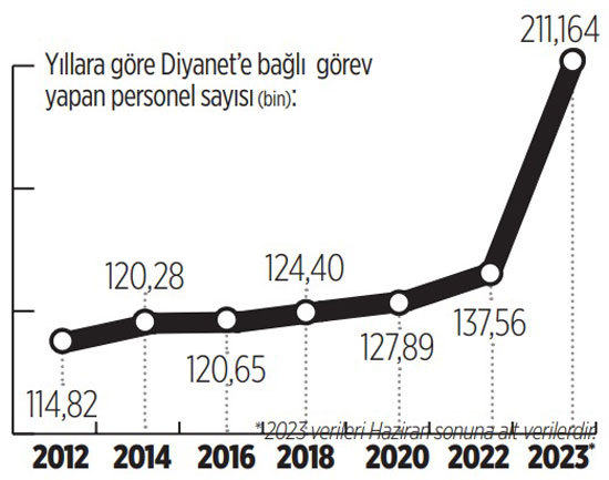 BirGün Gazetesi’nden Mustafa Bildircin’in haberine göre, dev bir orduyu anımsatan personel sayısı nedeniyle eleştirilen Diyanet İşleri Başkanlığı’nın haziran sonu itibarıyla personel sayısı belli oldu. 15 Temmuz 2016 tarihinde yaşanan darbe girişiminin ardından ihraçlar nedeniyle personel sayısı 2017’de 117 bine kadar gerileyen idare, yıllar itibarıyla kadrosunu daha da genişletti. Başkanlık, 2023 ilk yarısını 200 binin üzerinde personel ile tamamladı.