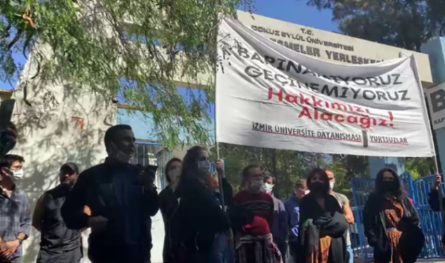 Bugün öğlen saatlerinde, Buca'daki Dokuz Eylül Üniversitesi İktisadi ve İdari Bilimler Fakültesi önünde toplanan, İzmir Üniversite Dayanışması ve Yurtsuzlar adlı grubun üyeleri, "Barınamıyoruz, Geçinemiyoruz, Hakkımızı Alacağız" yazılı pankart açtı. Üniversiteliler, bir kez daha barınma sorunlarına dikkat çekti. Okunan basın açıklamasında, "Üniversite öğrencileri olarak fahiş kira fiyatları ve niteliksiz, yetersiz, cinsiyetçi KYK yurtlarına karşı günlerdir sokaklardayız. Sırtımızda birer battaniyeyle bulunduğumuz kentlerin banklarında uyuyoruz. Bugün de üniversitemizin önünden sesimizi yükseltiyoruz. 2 yıla yakın süren pandemi süreciyle niteliksiz online eğitime mecbur bırakıldık. Ardından başvurduğumuz KYK yurtlarında 10 bininci yedekte kaldık. Fahiş kira fiyatları ile evsiz kaldık. Bazı arkadaşlarımız tüm bu nedenlerle kayıt dondurmak zorunda kaldı. Kazandığımız okulların bulunduğu şehirlere gelemediler" denildi."YURT KAPASİTESİ 16 BİN, ÖĞRENCİ SAYISI 200 BİNE YAKIN"