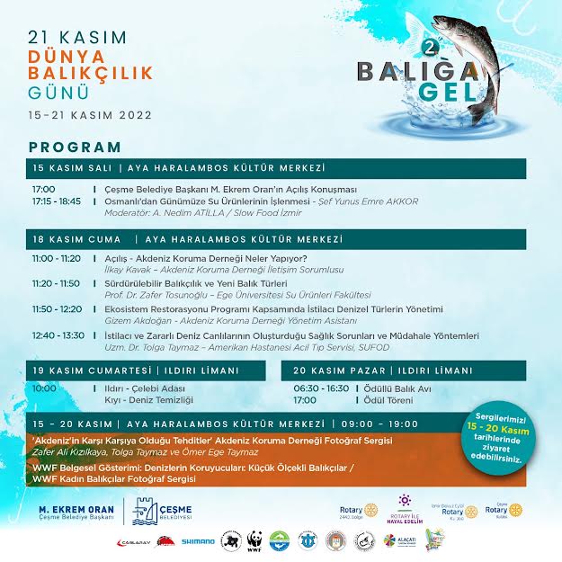 Çeşme Belediyesi ev sahipliğinde Dokuz Eylül Rotary Kulübü, bu yıl Dünya Su Ürünleri Yetiştiricileri ve Balıkçılar Forumu’nun 1997’de Yeni Delhi’de aldığı bir kararla her yıl 21 Kasım’da kutlanan Dünya Balıkçılık Günü’nü, Çeşme’de düzenlenecek etkinlikler ile kutlayacak. “Temiz Su ve Sürdürülebilir Dünya” odak noktası çerçevesinde gerçekleştirilecek olan etkinliklerde denizleri koruma, bilinçli avlanma ve su ürünlerinin işlenmesi konularına dikkat çekilecek.“Deniz kaynaklarımızı korumalıyız”Dünya Balıkçılık Günü’nünde böyle bir organizasyona ev sahipliği yapmaktan mutluluk duyduğunu belirten Çeşme Belediye Başkanı M. Ekrem Oran, “Bir milyardan fazla insanın gıda ihtiyacını ve geçimini sağlayan denizler, soluduğumuz oksijenin de neredeyse yarısını üretiyor. Denizlerimiz bizim yaşam kaynağımız, onları korumak ve deniz kaynaklarını gelecek nesillere aktarabilmek amacıyla bu etkinlikle farkındalık yaratmaya çalışıyoruz” dediDenizler için farkındalık yaratılacak Çeşme Belediyesi ile birlikte gerçekleştirecekleri kutlamalar ile denizler konusunda farkındalık yaratmak istediklerini belirten Dokuz Eylül Rotary Kulubü Başkanı Nilgün Tiyanşan, konusunda uzman birçok ismin etkinliklerde yer alacağını söyledi. Denizlerin korunmasının dünya üzerinde yaşayan bizler için çok önemli olduğunu vurgulayan Tiyanşan, bu etkinlik ile denizlerin korunması ve bilinçli avlanma ile deniz kaynaklarının gelecek kuşaklara aktarılması konusunda bir sürdürülebilirliğe dikkat çekeceklerini kaydetti. Etkinlik kapsamındaki etkinlikler15-20 Kasım tarihleri arasında Aya Haralambos Kilisesi’nde Akdeniz Koruma Derneği ve WWF’in “Akdeniz'in Karşı Karşıya Olduğu Tehditler” ve «Kadın Balıkçılar» - Fotoğraf Sergisinin yanı sıra derneklerin kısa film gösterimleri 09:00- 19:00 saatleri arasında ziyaretçilere açık olacak. 15 Kasım Salı günü saat 17:00 de Aya Haralambos Kilisesinde ünlü şef ve araştırmacı yemek yazarı Yunus Emre Akkor Slow Food İzmir kurucusu A. Nedim Atilla moderatörlüğünde “Osmanlı’dan günümüze su ürünlerinin işlenmesi» konulu sohbet toplantısını gerçekleştirecek. 18 Kasım Cuma günü bu yıl etkinliğin bilimsel destekçisi olan Akdeniz Koruma Derneği önderliğinde 11:00- 14:30 saatleri arasında Aya Haralambos Kilisesinde gerçekleştirilecek olan seminerde Akdeniz Koruma Derneği İletişim Sorumlusu İlkay Kavak “Akdeniz Koruma Derneği Neler Yapıyor?, Ege Üniversitesi Su Ürünleri Fakültesi öğretim üyesi ve Akdeniz Koruma Derneği kurucu başkanı Prof. Dr. Zafer Tosunoğlu “Sürdürülebilir Balıkçılık ve Yeni Balık Türleri”, Akdeniz Koruma Derneği Yönetim Asistanı Gizem Akdoğan “Ekosistem Restorasyonu Programı Kapsamında İstilacı Denizel Türlerin Yönetimi” ve Amerikan Hastanesi Acil Tıp Servisi, SUFOD Uzm. Dr. Tolga Taymaz “İstilacı ve Zararlı Deniz Canlılarının Oluşturduğu Sağlık Sorunları ve Müdahale Yöntemleri” üzerine sunumlarını gerçekleştirecek. 18 Kasım Cumartesi günü Deniz Ticaret Odası IMEAK Şubesi ve TURMEPA işbirliğinde 10:00-14:00 saatleri arasında Ildırı Limanında Kıyı temizliği gerçekleştirilecek.20 Kasım Pazar günü S.S. Ildırı Deniz Yolu Taşıma Kooperatifi teknelerinin ev sahipliğinde Dünya Balıkçılık Günü Ödüllü Balık Avı Yarışması gerçekleştirilecek. Shimano ve Çağlarav sponsorluğunda gerçekleşecek balık avı turunda, ekiplerin avladıkları balıklar jüri tarafından değerlendirilerek en çok, en çeşitli ve en büyük balığı tutan takımlara ödül verilecek.
