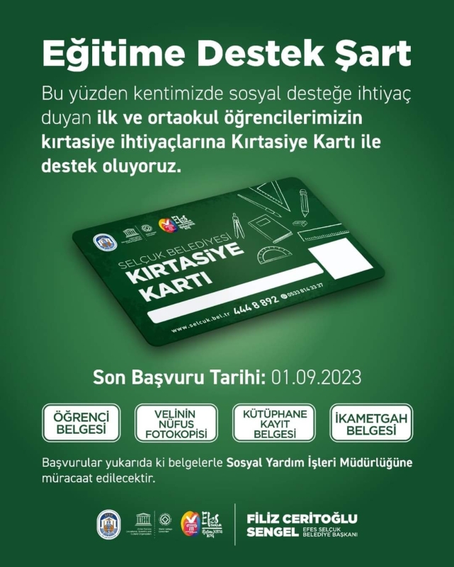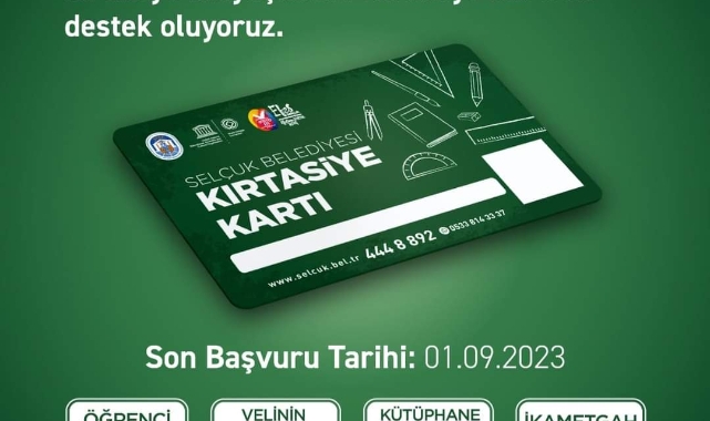 Sosyal desteğe ihtiyacı olan ailelerin çocuklarına verilecek Kırtasiye Kartı başvuruları, öğrenci belgesi, öğrenci velisinin nüfus kâğıdı fotokopisi, kütüphane kayıt belgesi ve ikametgâh belgesi ile Efes Selçuk Belediyesi Sosyal Yardım İşleri’ne yapılacak.