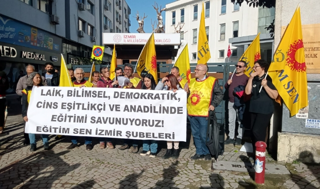Eğitim ve Bilim Emekçileri Sendikası (Eğitim Sen) İzmir Şubeleri 2023-2024 eğitim öğretim yılının birinci döneminin bitmesi sonrası İzmir İl Milli Eğitim Müdürlüğü önünde basın açıklaması gerçekleştirdi. "Laik, bilimsel, demokratik, cins eşitlikçi ve anadilde eğitimi savunuyoruz" yazılı pankart taşınan açıklamada "Laik bilimsel Anadilde eğitim" ve "çocuk işçi istemiyoruz" sloganları atıldı. Şubeler adına açıklama yapan Eğitim Sen İzmir 6No’lu Şube Başkanı Bülent Karakaş, Milli Eğitim Bakanlığı’nın (MEB) eğitimi dinselleştirmeye ve piyasalaştırmaya çalıştığını söyledi.