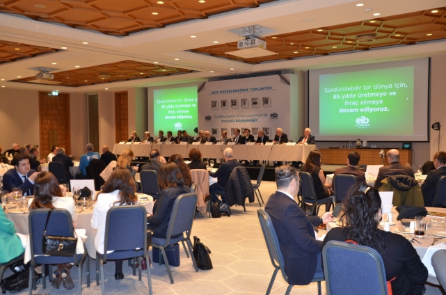 Sürdürülebilir enerji kaynakları için önemli projeleri hayata geçirmeyi planladıklarını ifade eden Eskinazi, “Sürdürülebilir kalkınmanın en önemli bileşenlerinden biri enerjidir. EİB gerek yenilenebilir enerji kaynaklarından elektrik üretimi, gerekse enerjinin verimli kullanılması açısından yatırımlar yapmayı ve önemli projeleri hayata geçirmeyi planlamaktadır. Sınırda Karbon Düzenleme Mekanizması'nın sektörümüze etkilerini değerlendiriyoruz. Şimdiden önlem almazsak, AB’ye ihracatımızda büyük maliyetlerle karşılaşacağız. Üreticiden başlayarak tüm kesimleri içine alacak şekilde stratejiler geliştirmeli, çimento, alüminyum, gübre, demir çelik ve elektrik gibi riskli kabul edilen sektörler başta olmak üzere tarım-gıda sektörlerimiz dahil, hızla farkındalık yaratarak rekabet gücümüzü olumsuz etkileyecek bu gelişmeleri bertaraf edecek yol haritaları hazırlayıp, uygulamaya koymalıyız. EİB 2024 yılında mesaisinin önemli bir kısmını bu konuya ayıracaktır” diye konuştu.