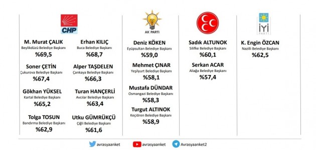2020 yılında başarı düzeyi ile öne çıkan Büyükşehir ilçe belediye başkanları sıralamasında CHP’li ilçe belediye başkanları öne çıktı. Türkiye genelindeki ilçe belediyeler arasında Beylikdüzü Belediye Başkanı M.Murat Çalık yüzde 69.5 oranla birinci olurken Buca Belediye Başkanı Erhan Kılıç yüzde 68.7 oranla ikinci, Çukurova Belediye Başkanı Soner Çetin de yüzde 67.4 oranla üçüncü sırada yer aldı.