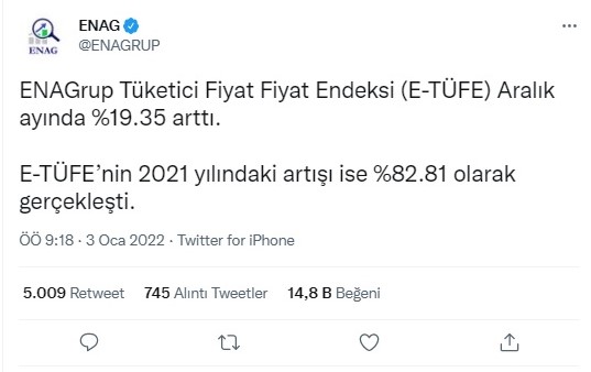 Akademisyenlerin ve ekonomistlerin oluşturduğu Enflasyon Araştırma Grubu (ENAG), Türkiye İstatistik Kurumu'nun (TÜİK) açıklamasından önce, hesapladığı aralık enflasyonunu duyurdu.
