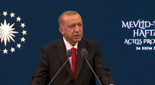 Cumhurbaşkanı Recep Tayyip Erdoğan, Beştepe Millet Kongre ve Kültür Merkezi'nde Mevlid-i Nebi Haftası Açılış Programı'na katıldı. Erdoğan'ınburada yaptığı konuşmadan öne çıkanlar şöyle:"Salgın dalgalar halinde yayılmaya devam ediyor. Aldığımız tedbirler ve sağlık çalışanlarımızın fedakarlığı sayesinde bu sağlık krizini hafif geçiriyoruz. Rehavete kapılmıyor, tedbiri asla elden bırakmıyoruz. Dengeli ve önü arkası iyi hesaplanmış adımlarla süreci yürütüyoruz. Gereken müdahaleleri yapmaktan çekinmiyoruz. İlgili bakanlarımız meseleyi takip ediyor. Biz de şahsen anbean durumu izliyor gerekli talimatları veriyoruz. Tüm dünyada hasta sayılarının ürkütücü boyutlara ulaştığı şu günlerde milletimden tedbirlere dikkat etmelerini istiyorum. 83 milyonun her ferdine görev düşüyor. Bir süre daha sabredecek sonra feraha ereceğiz.Bu dönemde hüznümüzü artıran tek şey corona virüsten hayatını kaybedenler değildir. Müslümanların içinde bulunduğu ahvaldir. Suriye'de rejimin ve teröristlerin saldırıları nedeniyle 1 milyon kardeşimiz hayatını kaybetti. 12 milyon kardeşimiz evlerini terk etmek zorunda kaldı. İslam beldelerinden göğe ezan sesleri değil anaların feryatları bombalarla enkaza çevrilen camilerin dumanları yükseliyor. Sırf Müslüman oldukları için öldürülen evlerinden yurtlarından kovulan kardeşlerimiz var. Fransa'da Almanya'da yaşananlar tüm dünyanın gözleri önünde oluyor. fakat Batı özellikle Hristiyan dünyasına Musevilere sesleniyorum. Bizim dinimizde Hristiyan olmak suç değil, Hristiyanlara ve Musevilere sahip çıkıyoruz. Fransa'da Müslümanlara zulüm varsa oraya da sahip çıkalım diye dünya liderlerine sesleniyorum. Avrupa ülkelerinde İslam düşmanlığının veba gibi yayoldığını görüyoruz. Fransa'da nasıl Türk markalı ürünler almayın deniliyorsa ben de buradan Fransız markalara iltifat etmeyin satın almayın diyorum. Buradan Şansölye Merkel'e sesleniyorum, hani sizde din özgürlüğü vardı. nasıl oluyorsa 100'e yakın polis camiye saldırıyor. Biz de gerçek bir din özgürlüğü var ama bunlarda yok. Siz gerçek manada Faşistsiniz siz gerçek manada Nazinin zincir halkalarısınız. Batı'da yükselen İslam karşıtlığı bugün artık kitabımıza peygamberimize topyekün bir saldırıya dönüşmüştür.İslam ve Müslüman düşmanlığı, kimi Avrupa ülkelerinde bizzat devlet başkanı seviyesinde desteklenen politika haline gelmiştir."