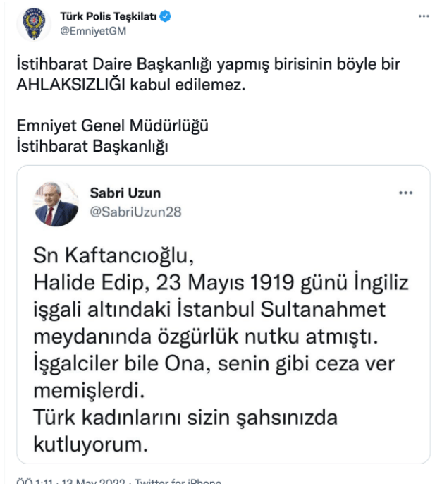 Eski Emniyet İstihbarat Daire Başkanı Uzun, Kaftancıoğlu’na sosyal medya paylaşımları nedeniyle “kamu görevlisine karşı görevinden dolayı hakaret”, “Türkiye Cumhuriyeti Devletini alenen aşağılamak” ve “Cumhurbaşkanına hakaret” suçlarından verilen 4 yıl 11 ay 20 gün hapis cezasının Yargıtay tarafından onanmasının ardından yaptığı paylaşımda, “Sn Kaftancıoğlu, Halide Edip, 23 Mayıs 1919 günü İngiliz işgali altındaki İstanbul Sultanahmet meydanında özgürlük nutku atmıştı. İşgalciler bile ona, senin gibi ceza vermemişlerdi. Türk kadınlarını sizin şahsınızda kutluyorum” demişti.Ardından Emniyet Genel Müdürlüğü, Kaftancıoğlu hakkında paylaşım yaparak Yargıtay’ın kararını eleştiren hakkında idari soruşturma başlatmıştı.