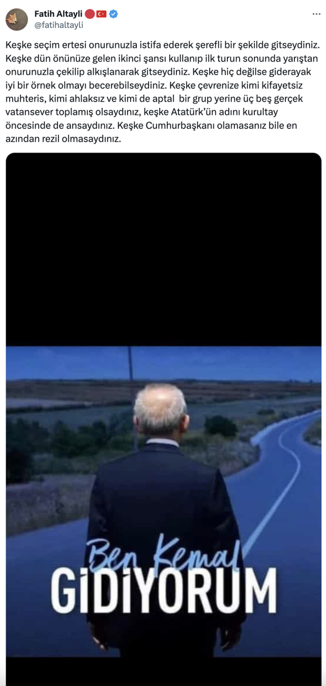 “Keşke seçim ertesi onurunuzla istifa ederek şerefli bir şekilde gitseydiniz. Keşke dün önünüze gelen ikinci şansı kullanıp ilk turun sonunda yarıştan onurunuzla çekilip alkışlanarak gitseydiniz. Keşke hiç değilse giderayak iyi bir örnek olmayı becerebilseydiniz. Keşke çevrenize kimi kifayetsiz muhteris, kimi ahlaksız ve kimi de aptal bir grup yerine üç beş gerçek vatansever toplamış olsaydınız, keşke Atatürk’ün adını kurultay öncesinde de ansaydınız. Keşke Cumhurbaşkanı olamasanız bile en azından rezil olmasaydınız.”