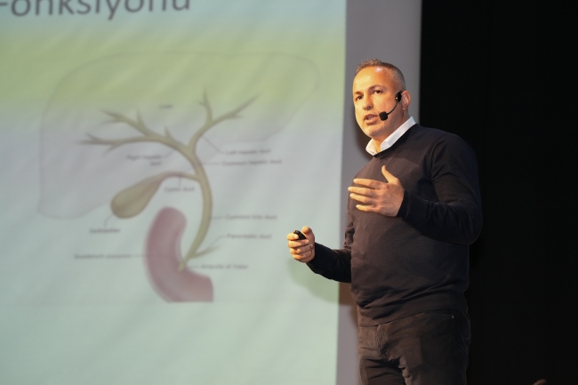 Op. Dr. Hakan Akıncı ise safra kesesinin sindirim sistemindeki önemi hakkında sunum yaptı. “Safra kesesi önemsiz görülüyordu ama çok önemli olduğu anlaşıldı. Safra kesesi, safrayı oniki parmak bağırsağına ileterek yağların sindirimini sağlar” diyen Op. Dr. Hakan Akıncı, “Yağların ufaltılarak emilmesini, hücre duvarında kullanılmasını sağlıyor. Sağlıksız şeyler yediğimizde, özellikle kolesterol safrada taşlar oluşturuyor. Taşlar safra kesesi kanalını tıkayabiliyor. Bu durum safra kesesinin safrayı atamamasına yol açıyor ve ağrı başlıyor. İki saat sonra safra kesesi duvarı iltihaplanıyor ve bulantı ku