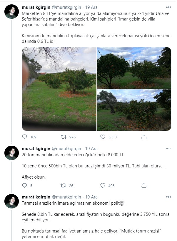 Çiftçinin üründen para kazanmadığını hatırlatan Küçükgirgin şunları kaydetti:"Marketten 8 TL'ye mandalina alıyor ya da alamıyorsunuz ya 3-4 yıldır Urla ve Seferihisar'da mandalina bahçeleri. Kimi sahipleri "imar gelsin de villa yapanlara satalım" diye bekliyor.Kimisinin de mandalina toplayacak çalışanlara verecek parası yok. Geçen sene dalında 0,6 TL idi.20 ton mandalinadan elde edeceği kâr belki 8.000 TL.10 sene önce 500 bin TL olan bu arazi şimdi 30 milyon TL. Tabi alan olursa...Afiyet olsun.Tarımsal arazilerin imara açılmasının ekonomi politiği.Senede 8.bin TL kar ederek, arazi fiyatının bugünkü değerine 3.750 YIL sonra eşitlenebiliyor.Bu noktada tarımsal faaliyet anlamsız hale geliyor. "Mutlak tarım arazisi" yeterince mutlak değil.Bunlar hep neoliberalizm. Planlamacı ekonomiyi terk etmek. Sorunlar o kadar hızlı ve çığ gibi büyüyor ki, ‘şimdilik karnımız doyuyor’a fitiz.Böyle giderse aç kalacağız.” (Oda TV)