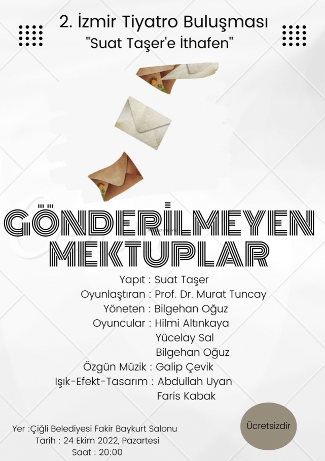 2. İzmir Tiyatroları Buluşması’nda 24 Ekim’de Çiğli Belediyesi Fakir Baykurt Salonu’nda Suat Taşer’in eseri “Gönderilemeyen Mektuplar” izleyici ile buluşacak. Prof. Dr. Murat Tuncay’ın oyunlaştırdığı, Bilgehan Oğuz’un yönettiği oyunda Hilmi Altınkaya, Yücelay Sal, Bilgehan Oğuz oynuyor.