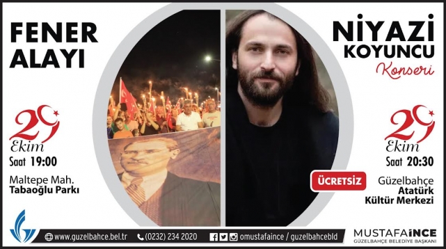 29 Ekim Cumhuriyet Bayramı’nın 99.yılı Güzelbahçe’de konserle kutlanacak. Resmi törenlerin ardından saat 19:00’da Maltepe Mahallesi Tabaoğlu Parkında toplanıp Güzelbahçe Atatürk Kültür Merkezi’ne meşaleli yürüyüş düzenlenecek. Ardından saat 20:30’da Niyazi Koyuncu konseriyle Cumhuriyeti’in 99.yılı kutlanacak.