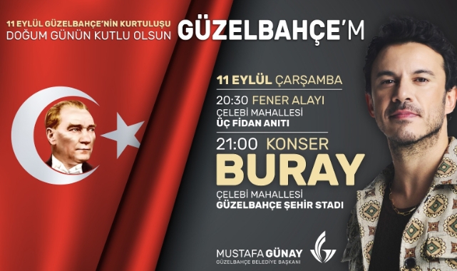 ‘Bu coşkuyu birlikte yaşayalım’ 11 Eylül Güzelbahçe’nin Kurtuluş Günü coşkusunu ilk gün ki heyecanla yaşadıklarını söyleyen Güzelbahçe Belediye Başkanı Mustafa Günay, ‘‘Güzelbahçe’mizin kurtuluş günü olan 11 Eylül’ü bu yıl değerli sanatçımız Buray’la kutlayacağız. Kurtuluş zaferimiz milletimizin birlik ve beraberlik içinde neler başarabileceğini gösteren bir destandır. Türk milletinin bu onurlu zaferini sonsuza dek yaşatacağımızı ve gelecek nesillere aktaracağız. Bu anlamlı günün heyecanını gelin birlikte kutlayalım. Fener alayımız ve sonrasında Güzelbahçe Stadı’nda sanatçı kardeşimiz Buray’la bu özel geceyi taçlandıracağız. Tüm halkımızı bu coşkuya ortak olmaya davet ediyorum” diye konuştu