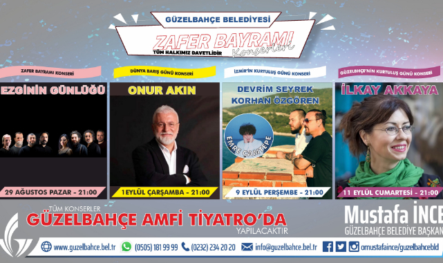 Güzelbahçe Belediyesi 30 Ağustos Zafer Bayramı Kutlamaları kapsamında bir dizi konser düzenleyecek. Pandemi kurallarına uygun olarak yapılacak 30 Ağustos Zafer Bayramı Kutlamaları Güzelbahçe Belediyesi Amfi Tiyatrosunda yapılacak. 29 Ağustos’ta Ezginin Günlüğü, 1 Eylül de Onur Akın, 9 Eylülde Devrim Seyrek, Korhan Özgören, Emre Çamtepe, 11 Eylülde İlkay Akkaya ile konserler son bulacak.
