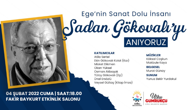 Kültür ve Sosyal İşler Müdürlüğü’nün organize edeceği etkinlik 4 Şubat Cuma günü saat 18:00’de Fakir Baykurt Etkinlik Salonu’nda gerçekleştirilecek. Etkinliğe CHP İzmir Milletvekili Atila Sertel, Şadan Gökovalı’nın eşi Tülay Gökovalı ve kızı Ekin Gökovalı Kolat, İzmir Gazeteciler Cemiyeti önceki dönem başkanlarından Misket Dikmen, şair Ünal Ersözlü ile yazarlar Okan Yüksel, Osman Akbaşak, ve Veysel Gültaş katılım gösterecek. Yunus Bekir Yurdakul’un moderatörlüğünde gerçekleştirilecek etkinlikte Köksal Coşkun ve Makbule Kaya’nın müzik dinletisinin ardından Murat Günay’ın yönetmenliğini yaptığı belgesel gösterimi yapılacak. Etkinliğe konuşmacı olarak katılacak olan yazar Veysel Gültaş sevilen kitaplarını okurları için imzalayacak.