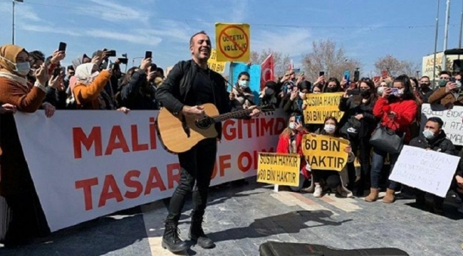 Haluk Levent, Ulus’ta bir araya gelerek açıklama yapan öğretmenlere şarkı söyleyerek destek verdi.