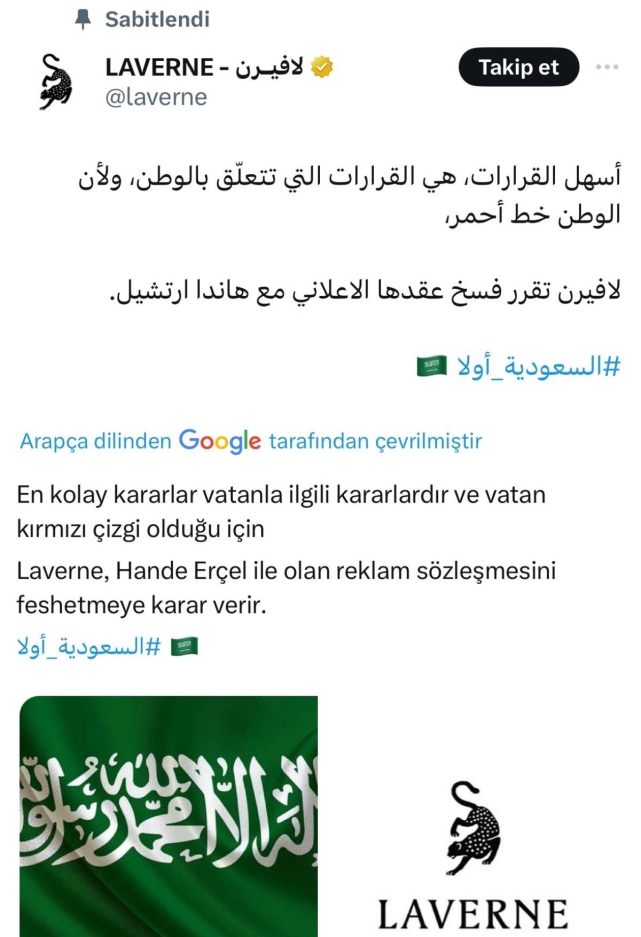 Suudi parfüm markası Laverne’nin reklamında oynayan ünlü oyuncu Hande Erçel, dün geceki Süper Kupa skandalının ardından sosyal medya hesabından Mustafa Kemal Atatürk’ün fotoğrafı paylaştı.Konuya dair açıklama yapmadığı için sosyal medyada yurttaşlar tarafından eleştiren Erçel, bu sabah erken saatlerde Instagram hesabından paylaştığı Atatürk görseline, “Fikrin fikrimiz, yolun yolumuz Ata’m” yazdı. SUUDİ ARABİSTAN BAYRAKLI DUYURUErçel’in paylaşımının ardından ise Suudi şirketinden bu sabah 06.17’de açıklama yapıldı.Laverne’nin X hesabından Arapça yapılan açıklamada, “vatanın kırmızı çizgi” olduğu ifade edilerek Hande Erçel ile olan sözleşmenin feshedildiği duyuruldu.Paylaşımda Suudi Arabistan bayrağı da kullanıldı.