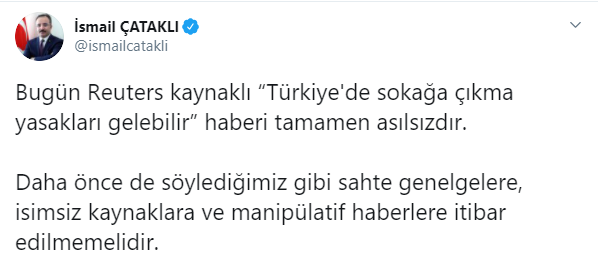 İÇİŞLERİ BAKANLIĞI YALANLADIİçişleri Bakanlığı, ''Bugün reuters kaynaklı “Türkiye'de sokağa çıkma yasakları gelebilir” haberi tamamen asılsızdır. Daha önce de söylediğimiz gibi sahte genelgelere, isimsiz kaynaklara ve manipülatif haberlere itibar edilmemelidir'' açıklamasında bulundu.