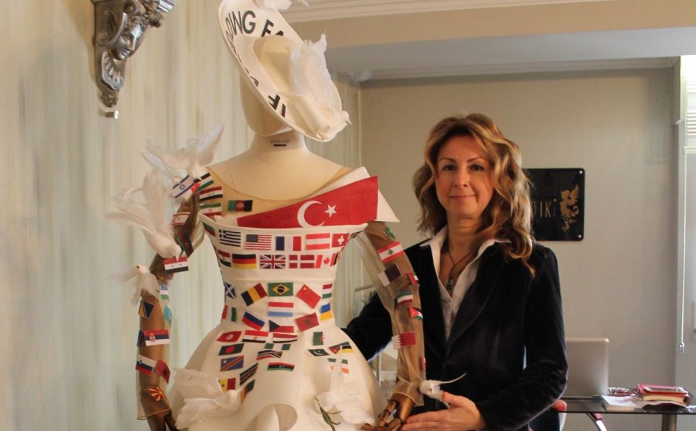 “Bu gelinliği tasarlarken katılımcı ülkelerin bayraklarını taşımak istedim. Daha sonra dünyadaki sorunlar, savaşlar, savaşlarda çocukların ölmesi derken bayrakları bölgelere göre ayırmaya başladım. Daha önce de bir tasarım yapmıştım. Yine barış ve savaş temalıydı. Bu kez barış güvercinleri kullanmak istedim. Kuşların gagalarına Orta Doğu’da sorunlu olan İsrail, Filistin’in bayraklarını koydum. Suriye de öyle. Sağ kola Türki Cumhuriyetleri yerleştirdim. Avrupa, Amerika, Kuzey Afrika aynı şekilde gelinlikte yer alıyor. Orta Doğu’daki petrol ülkelerini sol kola yerleştirdim. Bayrakları yerleştirirken bedende sınırlı kaldım. Doğal kumaşlar kullanmayı seviyorum. Bayrakları keçeden yaptım, yüzde yüz yerli doğal malzeme. Yüzde yüz Denizli pamuk sateni kullandım.”
