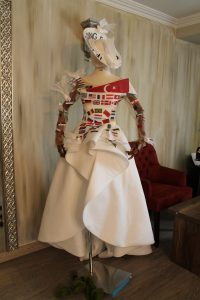 Dünya barışına vurgu yapan Gedik, “İlk etapta katılımcı ve misafir olarak gelen ülkeleri düşündüm. Ön tarafa katılımcılarımızı koydum, arka yüzünde ise misafirlerimiz var. 81 ülkenin bayrağını yerleştirdim. Hem ön hem de arkada bayraklar bulunuyor. Dünya barışı ile ilgili mesaj vermek istedim. 2018’in ilk haftalarında dünya barışı ile ilgili olacak hazırladığım gelinlik. Bu gelinliği IF Wedding Fashion İzmir için özel tasarladım, başındaki şapkada fuarın adı da yazıyor” dedi.