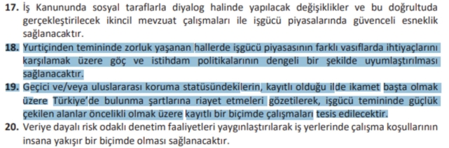 Programda yer alan, "Yurtiçinde temininde zorluk yaşanırsa farklı vasıflarda ihtiyaçları karşılamak üzere göç ve istihdam politikaları uyumlaştırılacak" ifadeleri dikkat çekti.