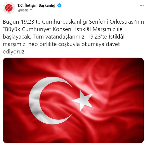 İletişim Başkanlığı'nın sosyal medya hesabından cumhuriyet bayramı ile ilgili vatandaşlara çağrıda bulunuldu. Açıklamada, "Bugün 19.23'te Cumhurbaşkanlığı Senfoni Orkestrası'nın "Büyük Cumhuriyet Konseri" İstiklâl Marşımız ile başlayacak. Tüm vatandaşlarımızı 19.23'te İstiklâl marşımızı hep birlikte coşkuyla okumaya davet ediyoruz." denildi.
