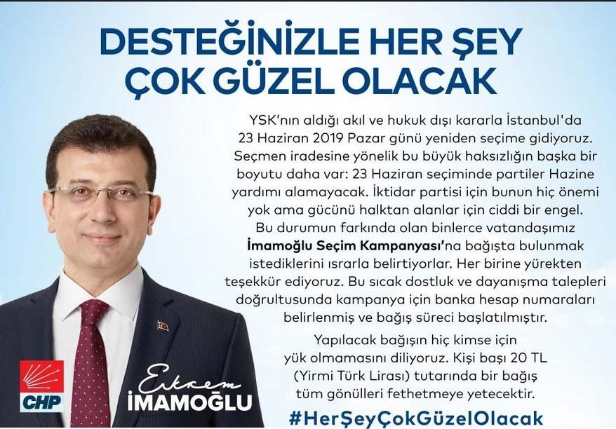 Cumhuriyet Halk Partisi Ekrem İmamoğlu'nun başkan seçildiği ve YSK tarafından iptal edilen İstanbul seçimlerinde yeni kampanya döneminde kullanılmak üzere bağış kampanyası başlattı. Kampanyada vatandaşlar 20'şer lira bağış yapmaya çağırıldı. Bağış yapılırken mutlaka bağışcının kendi TC numarasını da belirtmesi, aksi takdirde paranın İmamoğlu yerine Hazine'ye aktarılacağı bildirildi. Ayrıca CHP tarafından, bağışta bulunanların Alıcı ismine 'Ekrem İmamoğlu' değil, 'Cumhuriyet Halk Partisi Genel Merkezi' yazmaları gerektiği, bazı bankaların alıcı ismi nedeniyle gönderilen paraları iade ettiği ifade edildi.