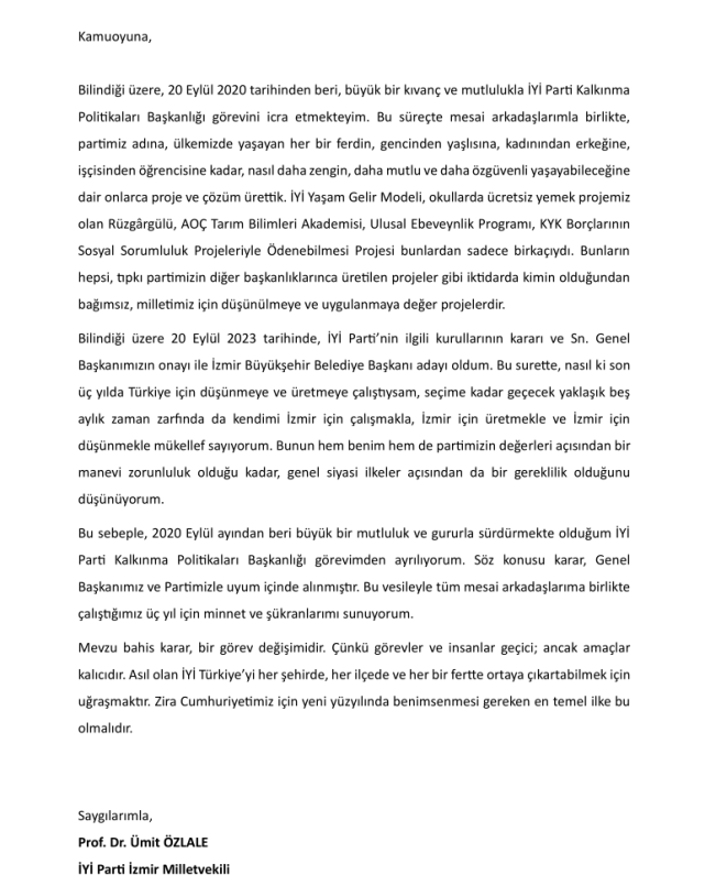 “Yerel seçimlere 5 ay kala İzmir Büyükşehir Belediye Başkan adaylığıma ilişkin çalışmalarıma ağırlık verebilmek için 3 yıldır büyük bir gururla üstlendiğim İYİ Parti Kalkınma Politikaları Başkanlığı görevimden kendi isteğimle ve Sayın Genel Başkanımızın oluruyla ayrılıyorum. Ekte kaleme aldığım (biraz da duygusal!) mektubu bulabilirsiniz. Ülkemiz için, gelecek İYİ günler için ilk günkü heyecanla ve birliktelikle çalışmaya devam edeceğiz."