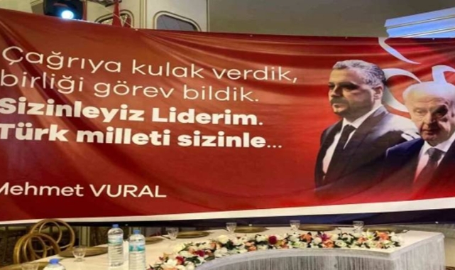 İYİ Parti'den MHP'ye geçen Mehmet Vural'ın afişinde, "Çağrıya kulak verdik, birliği görev bildik. Sizinleyiz liderim" ifadeleri kullanıldı.