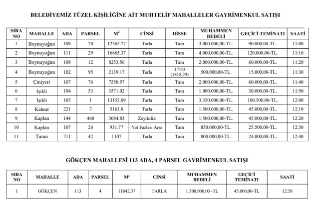 Tire Belediyesi'nin satışını hedeflediği taşınmazlar ise şöyle: