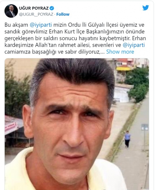 - “İYİ Parti’mizin Ordu İli Gülyalı İlçesi üyemiz ve sandık görevlimiz Erhan Kurt İlçe Başkanlığımızın önünde gerçekleşen bir saldırı sonucu hayatını kaybetmiştir. Erhan kardeşimize Allah’tan rahmet ailesi, sevenleri ve İYİ Parti camiamıza başsağlığı ve sabır diliyoruz, Millet olarak bizleri ayrıştıran dilin sonucu olan bu hain saldırıyı ve tüm fail/failleri nefretle kınıyoruz. Sürecin kararlı takipçisi olacağız.”