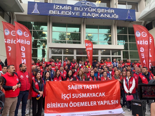 Daha da vahimi, İzmir Büyükşehir Belediyesi’nde yıllardır çalışan arkadaşlarımız, farklı birimlerden şirketlere aktarılıp havuz adı altında yaklaşık 300 kişi ücretsiz izne çıkarılmış, maaşsız ve sigortasız bir şekilde açlığa mahkûm edilmiştir. Ayrıca, merkezi iktidarın zorunlu emeklilik politikalarını eleştirirken; İzmir Büyükşehir Belediyesi bürokratlarının da benzer bir şekilde çalışan işçileri emekliliğe zorlaması, iş vermemesi ve bu yolla işten uzaklaştırması kabul edilemez bir tutumdur. Biz emekçiler bunu hak etmiyoruz, asla ve asla kabul etmiyoruz Artık sabrımız kalmadı! Bizler bu açıklamayı yapmamak için aylardır sabırlı bir şekilde çözüm bulunmasını bekledik, diyalog kapısını her zaman açık tuttuk. Belediye bürokratları her defasında, belediyenin içinde bulunduğu maddi krizi aşacaklarını söylediler. Biz de aylarca bu sorunun çözüme kavuşmasını sabırla bekledik. Ancak artık bilinmelidir ki; biz emekçiler sabırla beklerken borçlarımız büyüdü, geçimimiz zorlaştı, kriz bizde derinleşti. Kredi kartlarımız, kredilerimiz, faturalarımız ödenemez hâle geldi. Okulların açılmasıyla masraflarımız arttı, çocuklarımızın ihtiyaçlarını karşılamakta zorlanıyoruz. Biz emekçiler olarak taleplerimizi yineliyoruz: Şirkete iade edilen arkadaşlarımız bir an önce işbaşı yaptırılsın! Biz sadaka değil, hak ettiğimiz ücretleri istiyoruz! Fazla mesai ücretlerimiz, ikramiyelerimiz, gıda kartı alacaklarımız ve öğrenim yardımlarımız için derhâl bir ödeme takvimi belirlensin! Aksi hâlde bu cuma günü mesai bitimine kadar oturma eylemimize devam edeceğiz"