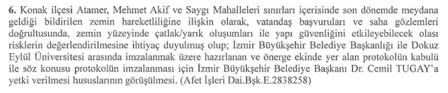 ÖMER FARUK ALTIN/EGE’YE BAKIŞ - İzmir Büyükşehir Belediyesi Ocak Ayı Meclis Toplantısı Üçüncü Birleşimi Meclis Başkanvekili Zafer Levent Yıldır yönetiminde gerçekleşti.ÜÇ MAHALLEDE RİSK DEĞERLENDİRMESİ İÇİN PROTOKOLKonak ilçesindeki Atamer, Mehmet Akif ve Saygı Mahalleleri'nde Onat Tüneli inşaatı sırasında zemin hareketliliğine ilişkin olarak, vatandaş başvuruları ve saha gözlemleri doğrultusunda risklerin değerlendirilmesi için Dokuz Eylül Üniversitesi ile İzmir Büyükşehir Belediyesi arasında protokol imzalanması amacıyla İzmir Büyükşehir Belediye Başkanı Cemil Tugay'a yetki verilmesi gündeme geldi.İlgili önerge; Bütçe Hukuk, Deprem ve Afet Komisyonu'na havale edildi.İlgili önerge şu şekilde: