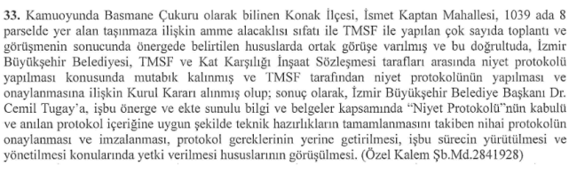 BASMANE ÇUKURU İÇİN TUGAY'A TAM YETKİ!Basmane Çukuru'na ilişkin de önemli bir önerge meclisin gündemine geldi.Konak ilçesi İsmet Kaptan Mahallesi’nde bulunan 1039 ada 8 parseldeki taşınmaz için Tasarruf Mevduatı Sigorta Fonu (TMSF) ile gerçekleştirilen görüşmeler sonrasında tarafların niyet protokolü konusunda uzlaşmaya vardığı belirtildi.Meclis gündemindeki önergenin kabul edilmesi halinde İzmir Büyükşehir Belediye Başkanı Cemil Tugay'a tam yetki verilmesi planlanıyor.İlgili önerge, Bütçe ve Hukuk Komisyonlarına havale edildi.İlgili önerge şu şekilde: