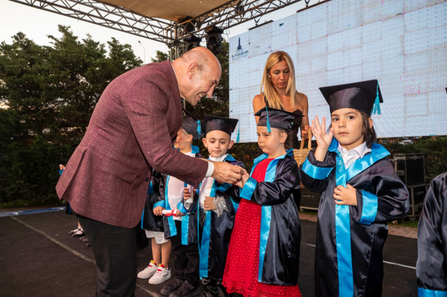 İzmir Büyükşehir Belediyesi' ne bağlı, kent merkezi dışında Dikili, Kemalpaşa, Beydağ ve Aliağa’da da hizmet veren toplam 11 İZELMAN anaokulunun öğrencileri mezun oldu. İzmir Büyükşehir Belediye Başkanı Tunç Soyer erken çocukluk döneminde erişilebilir eğitim hizmeti sunan İZELMAN anaokullarındaki öğrencilerin mezuniyet heyecanını aileleriyle paylaştı. Tarihi Havagazı Fabrikası’ndaki mezuniyet törenine Başkan Tunç Soyer’in yanı sıra Beydağ Belediye Başkanı Feridun Yılmazlar, İzmir Büyükşehir Belediyesi Başkan Vekili Mustafa Özuslu, İzmir Büyükşehir Belediyesi Genel Sekreteri Barış Karcı, İZELMAN Yönetim Kurulu Başkanı Erhan Bey, İZELMAN Genel Müdürü Burak Alp Ersen, İzmir Büyükşehir Belediyesi Genel Sekreter Yardımcısı Ertuğrul Tugay ve öğrenci velileri katıldı. Mezuniyet töreni miniklerin oluşturduğu Sürdürülebilirlik Korosu’nun şarkılarıyla başladı. Yeni öğrencilere bayraklarını teslim eden mezunlar Başkan Soyer’e çiçek takdim etti. Törende geçen Ağustos ayında hayatını kaybeden İZELMAN Yönetim Kurulu Başkanı Adnan Oğuz Akyarlı da anıldı.