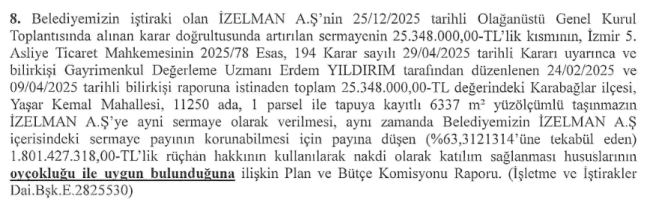 ÖMER FARUK ALTIN/EGE’YE BAKIŞ - İzmir Büyükşehir Belediyesi Ocak Ayı Meclis Toplantısı Üçüncü Birleşimi Meclis Başkanvekili Zafer Levent Yıldır yönetiminde gerçekleşti.İZELMAN'A 1.8 MİLYARLIK SERMAYE ARTIRIMIMeclis gündeminde belediye iştiraki İZELMAN A.Ş.'nin sermaye artırımı ve kaynak aktarımı görüşüldü. Önergede Karabağlar’da bulunan 25 milyon 348 bin TL değerindeki taşınmazın İZELMAN’a 'ayni sermaye' olarak devredilmesi ve belediyenin şirketteki payını korumak adına 1 milyar 801 milyon TL’lik rüçhan hakkını nakit olarak kullanması oylandı. Oylama sonucunda ilgili önerge oyçokluğu ile kabul edildi.İlgili önerge şu şekilde: